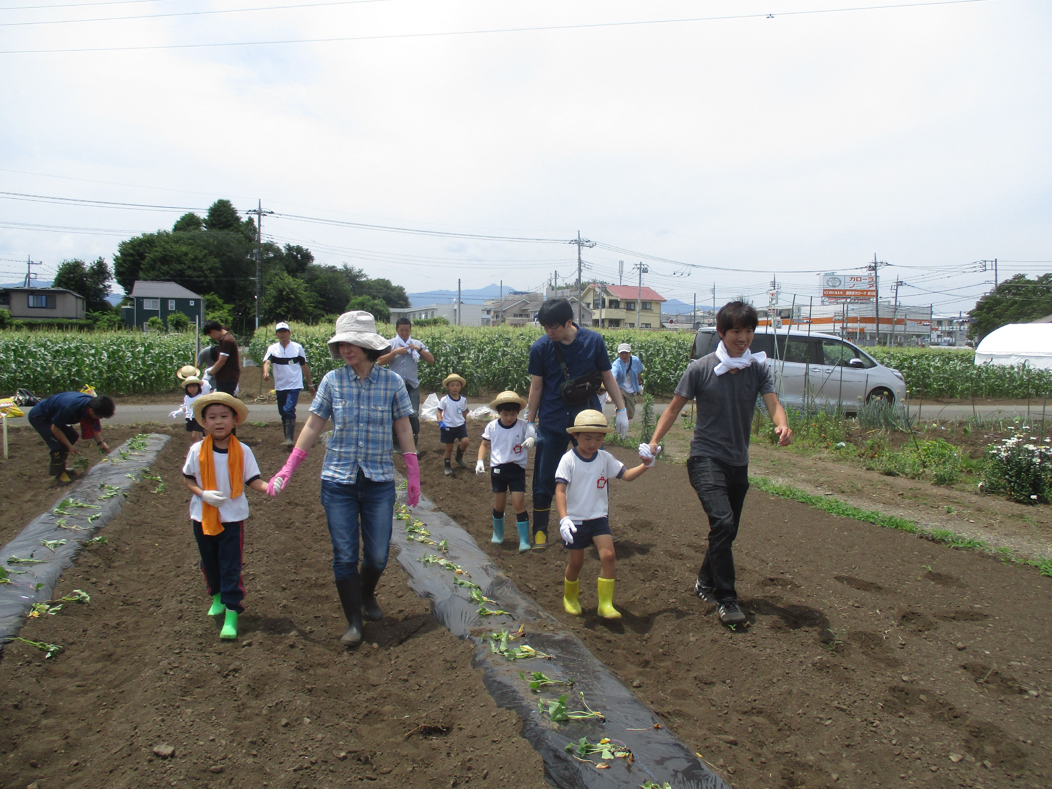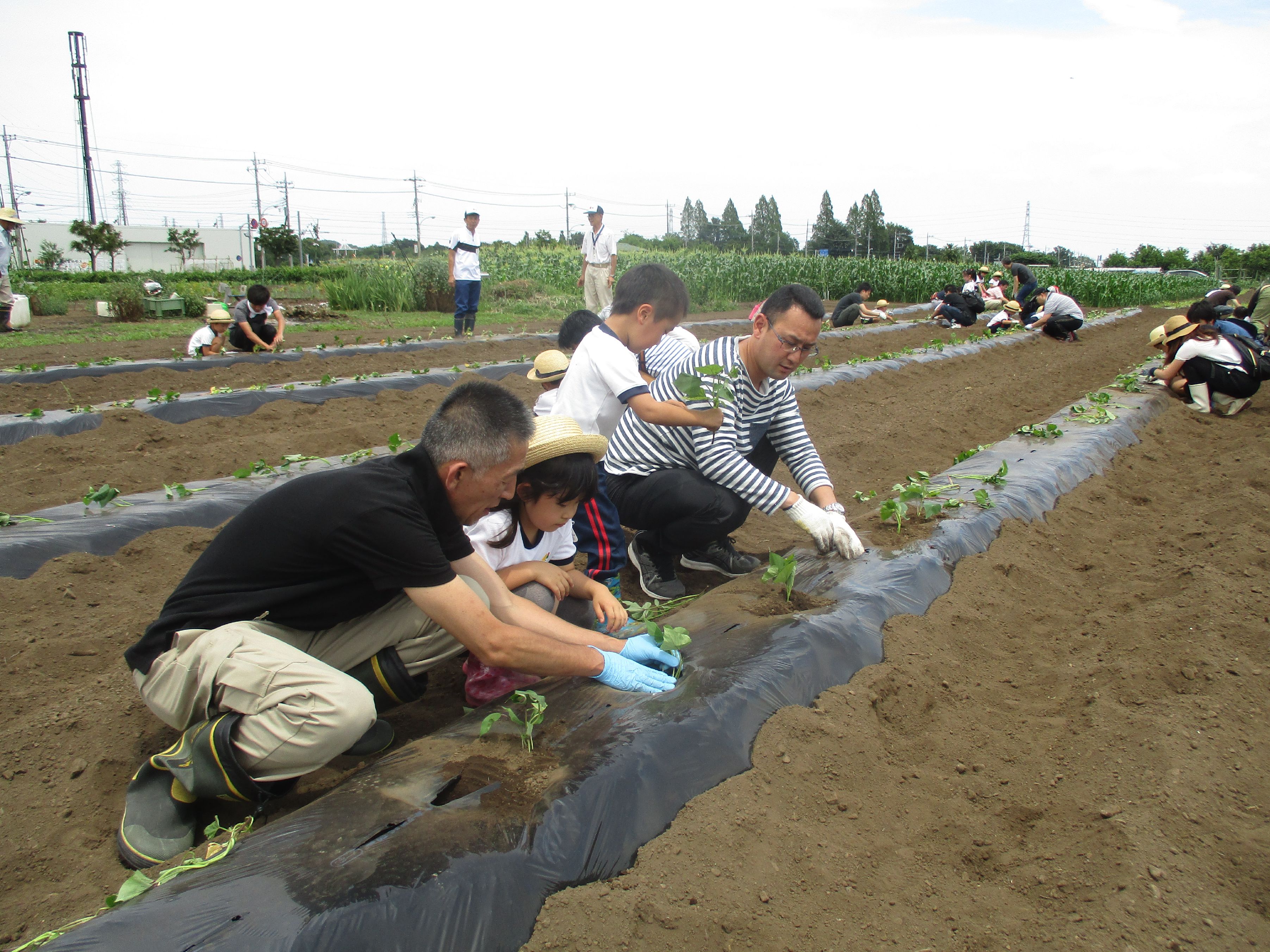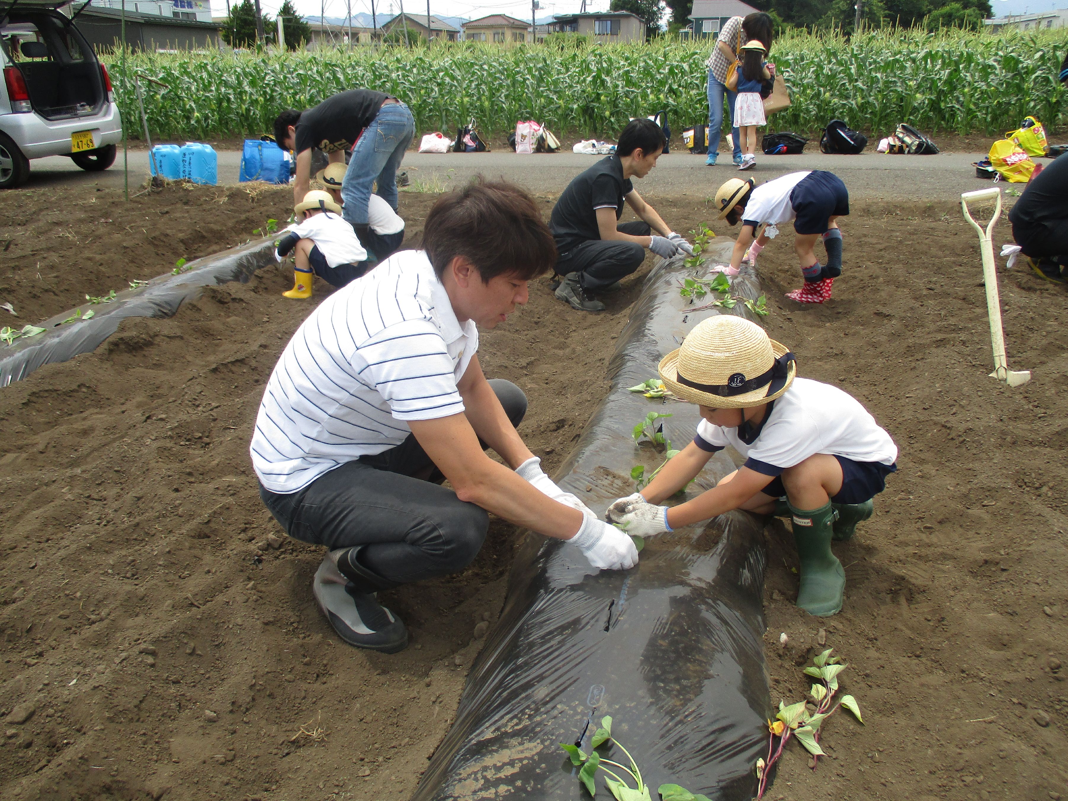 親子でさつまいもの苗の