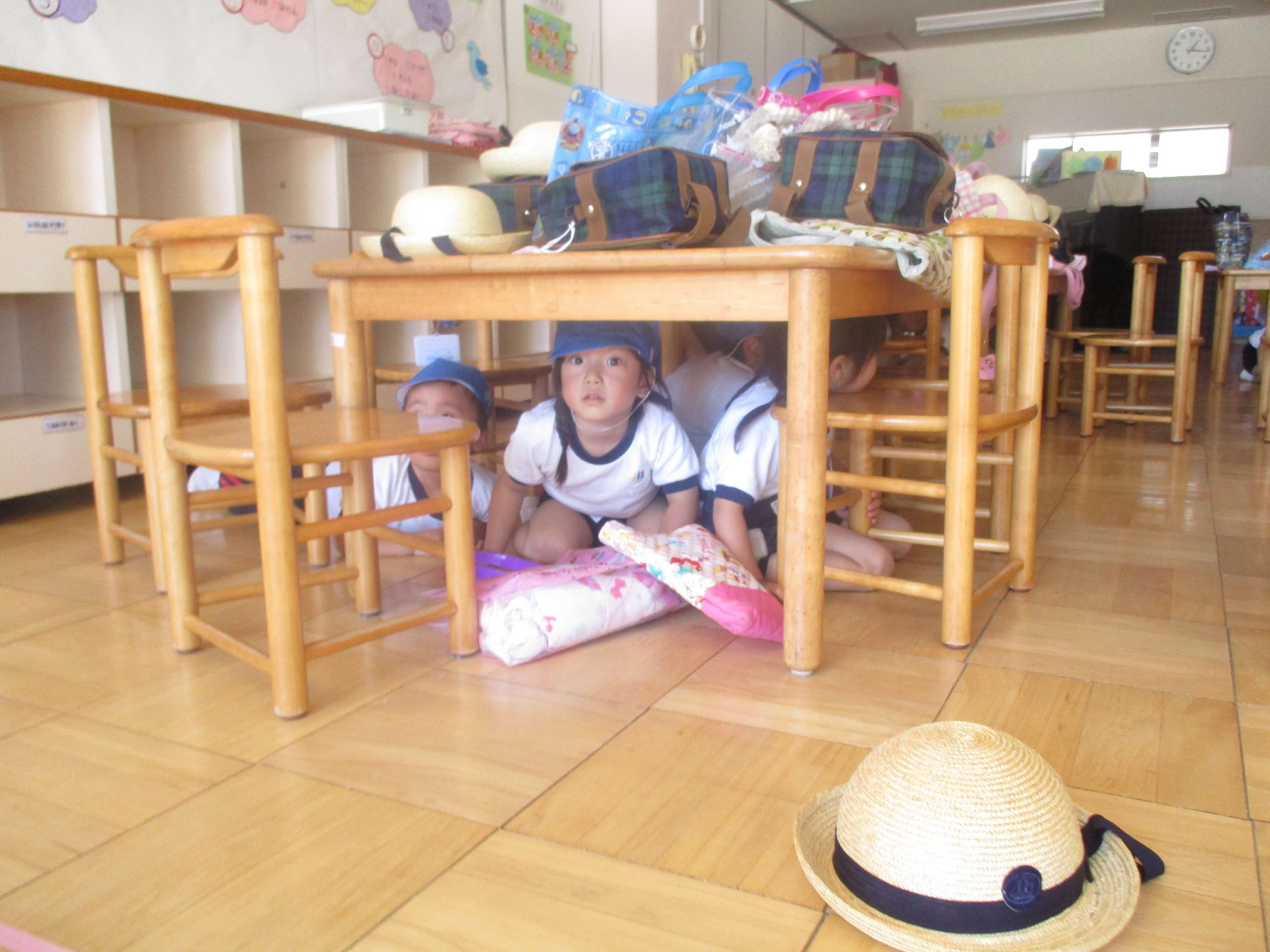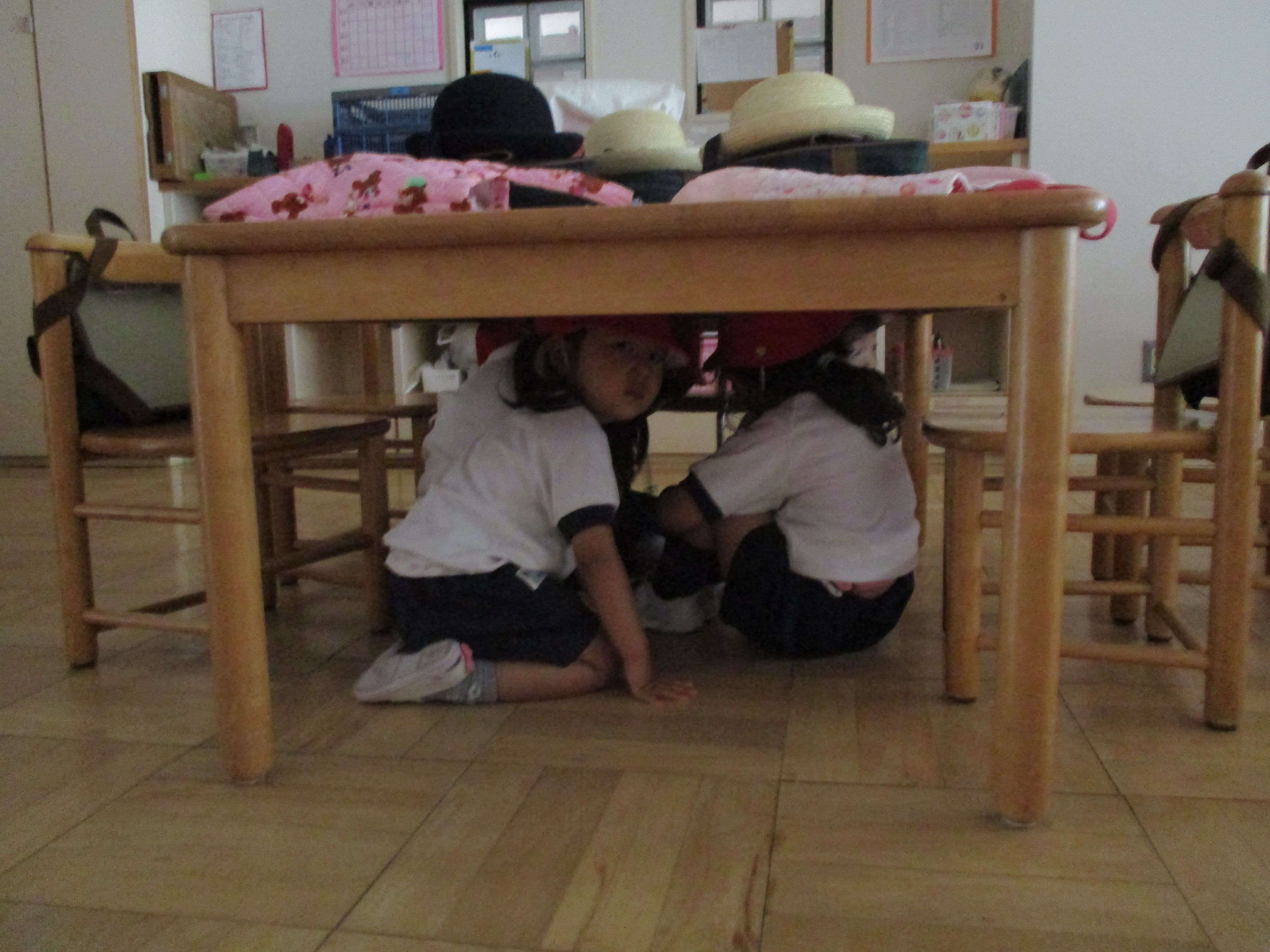 机の下にもぐり頭を守ります